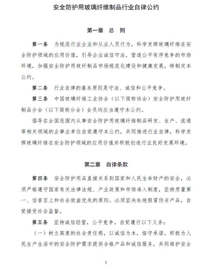 為規(guī)范行業(yè)企業(yè)和從業(yè)人員行為,科學(xué)發(fā)揮玻璃纖維在安全防護(hù)領(lǐng)域的應(yīng)用價(jià)值,推動(dòng)安全防護(hù)用玻纖制品市場(chǎng)規(guī)范化建設(shè)和健康發(fā)展,中國(guó)玻璃纖維工業(yè)協(xié)會(huì)安全防護(hù)用玻纖制品分會(huì)一屆三次理事會(huì)審議通過(guò)了《安全防護(hù)用玻璃纖維制品行業(yè)自律公約》的議案,現(xiàn)正式予以發(fā)布,請(qǐng)各單位參照?qǐng)?zhí)行。同時(shí),中國(guó)玻璃纖維工業(yè)協(xié)會(huì)面向分會(huì)全體會(huì)員及廣大安全防護(hù)用玻纖制品從業(yè)單位征集《安全防護(hù)用玻璃纖維制品行業(yè)自律公約》締約單位。